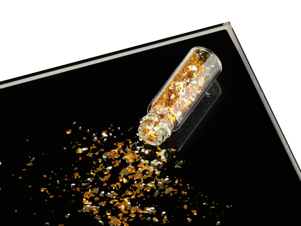 Ehető, ezüst–arany színű dekorációs csillámpor elegáns mini flakonban, ajándékdobozzal. Kiválóan alkalmas pralinék, torták, desszertek és petit fours díszítésére.
