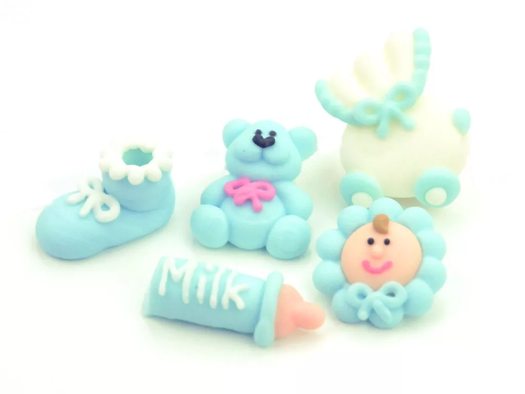 Csodálatos, aprólékosan kidolgozott keresztelő szett babakék színben 5 különböző elemmel. A szett tartalmaz egy édes babacipőt, babakocsit, aranyos babaarcot, mackófigurát és cumisüveget – minden, ami egy kisfiú keresztelő tortájához vagy babaváró süteményhez kell. Prémium minőségű cukortömegből készítve.
