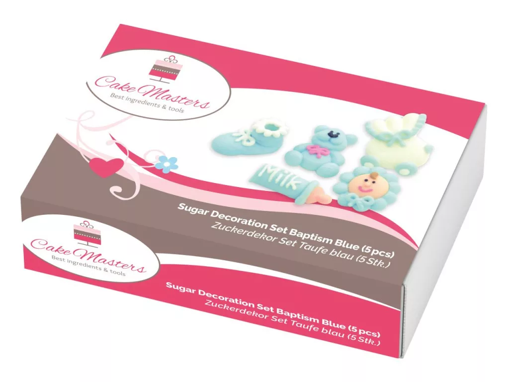 Cake-Masters keresztelő szett kék cukorból, 5 elemes babadísz tortára