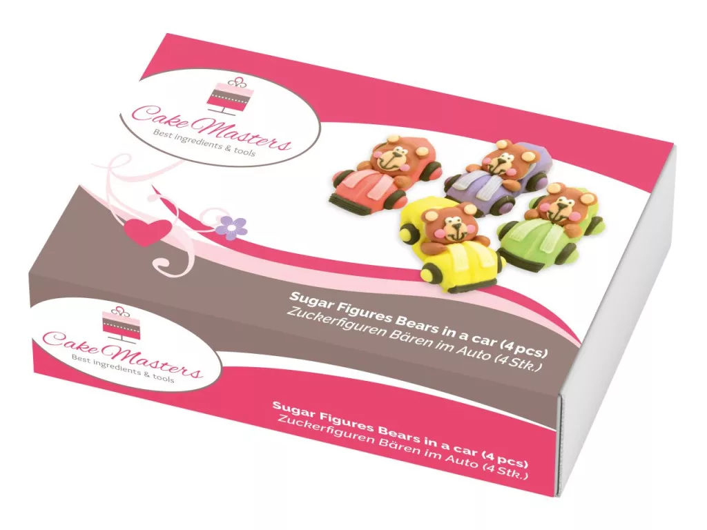 Varázsold izgalmas autóversennyé a tortádat ezekkel a vidám mackó figurákkal! Kézzel készített, részletgazdag cukor díszítőelemek 4 darabos kiszerelésben - minden maci a saját színes versenyautójában ül. Prémium minőségű cukortömegből, gondosan kidolgozott részletekkel. Az autók színei: sárga, zöld, piros és lila.