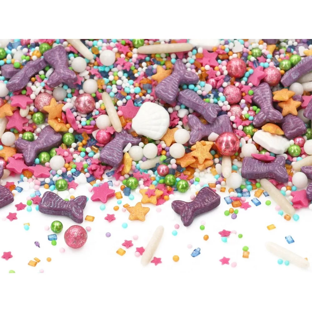 Mesés, hableány témájú szórócukor mix kagylókkal, sellőfarkakkal, csillagokkal és színes gyöngyökkel. Tökéletes torták, cupcake-ek és desszertek díszítésére.