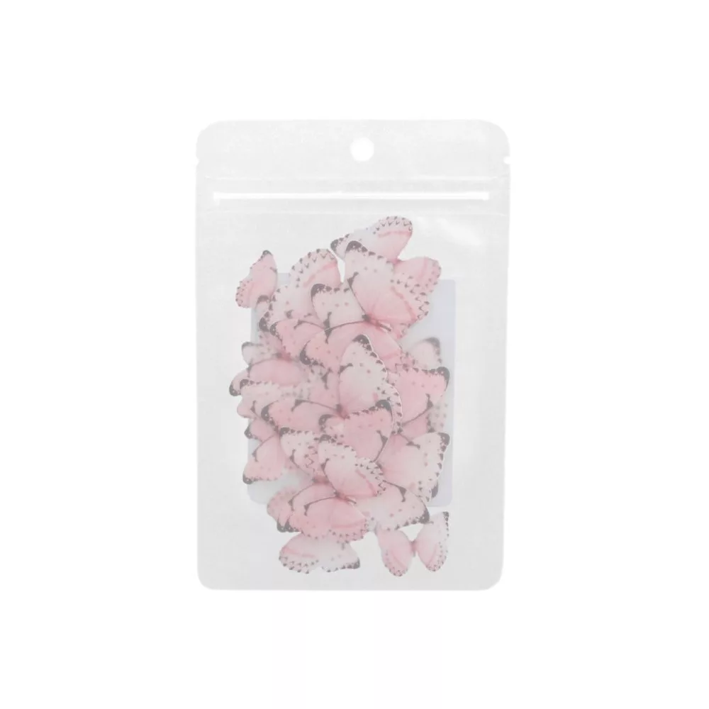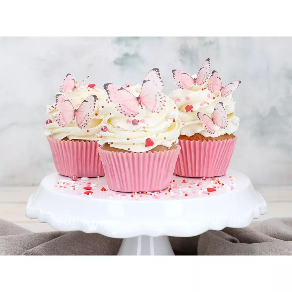 Ehető, előre kivágott rózsaszín pillangós ostyadíszek tortákhoz és cupcake-ekhez. Színes, könnyen használható dekoráció fondant és marcipán felületekre.