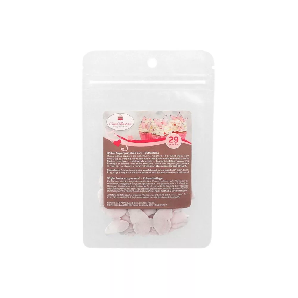 A Cake-Masters rózsaszín pillangós ostyalap szett 29 darab gyönyörű, ehető pillangó mintát tartalmaz különböző méretekben, melyekkel bármely torta, sütemény vagy cupcake különlegesen elegáns megjelenést kap. A különböző méretű pillangók (3 × 2,5 cm-től 3 × 4 cm-ig) finom, nőies díszítést biztosítanak esküvői, születésnapi vagy tavaszi alkalmakra.