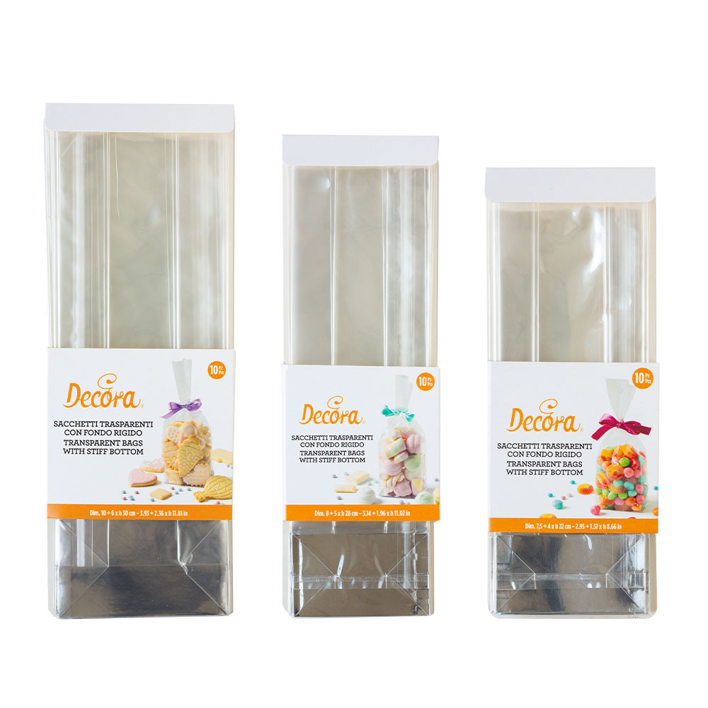 Átlátszó, élelmiszerbiztonságos műanyag tasakok praktikus, merev aljjal. Tökéletesek cukorkák, bonbonok, kekszek és más édességek csomagolására. A kartonból készült merev talp stabil elhelyezést biztosít a tasakok számára.
