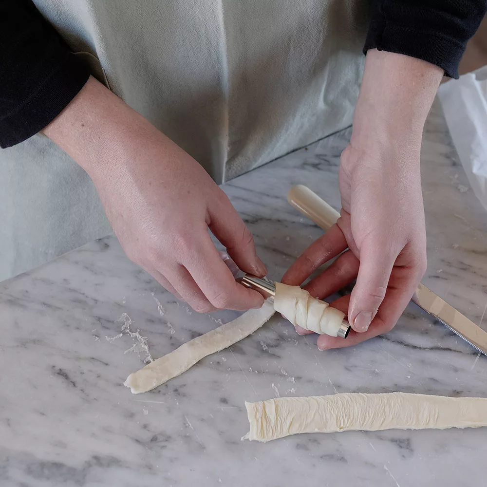 – A tésztát tekerd a hengerre úgy, hogy a szélek kissé fedjék egymást.
