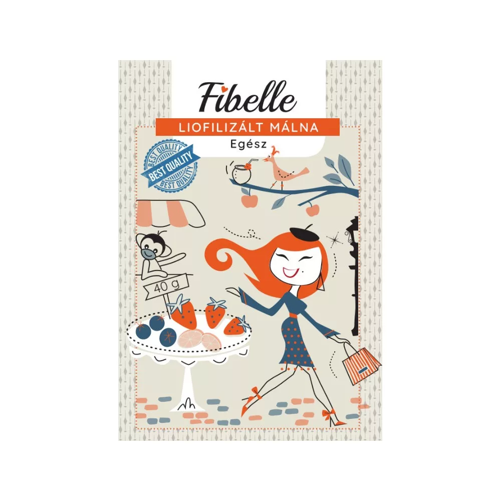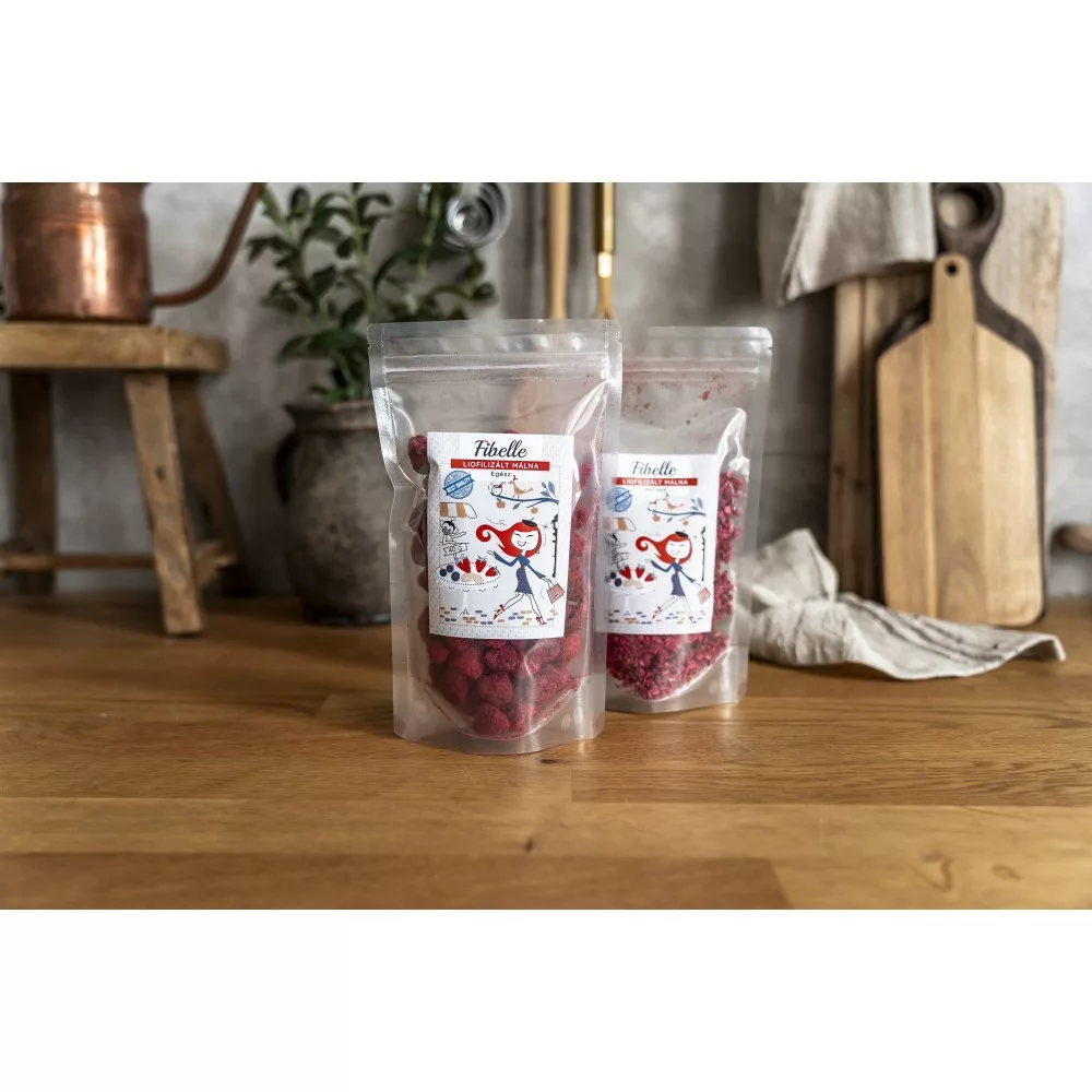A Fibelle liofilizált málna egész szemekkel, 40 g-os kiszerelésben tökéletes választás, ha intenzív málnaízre vágysz hozzáadott cukor nélkül. Ideális süteményekhez, reggelihez, vagy akár dekorációnak is. A liofilizálásnak köszönhetően megőrzi a friss málna ízét és tápanyagait, így bármikor élvezheted a gyümölcs természetes zamatát!