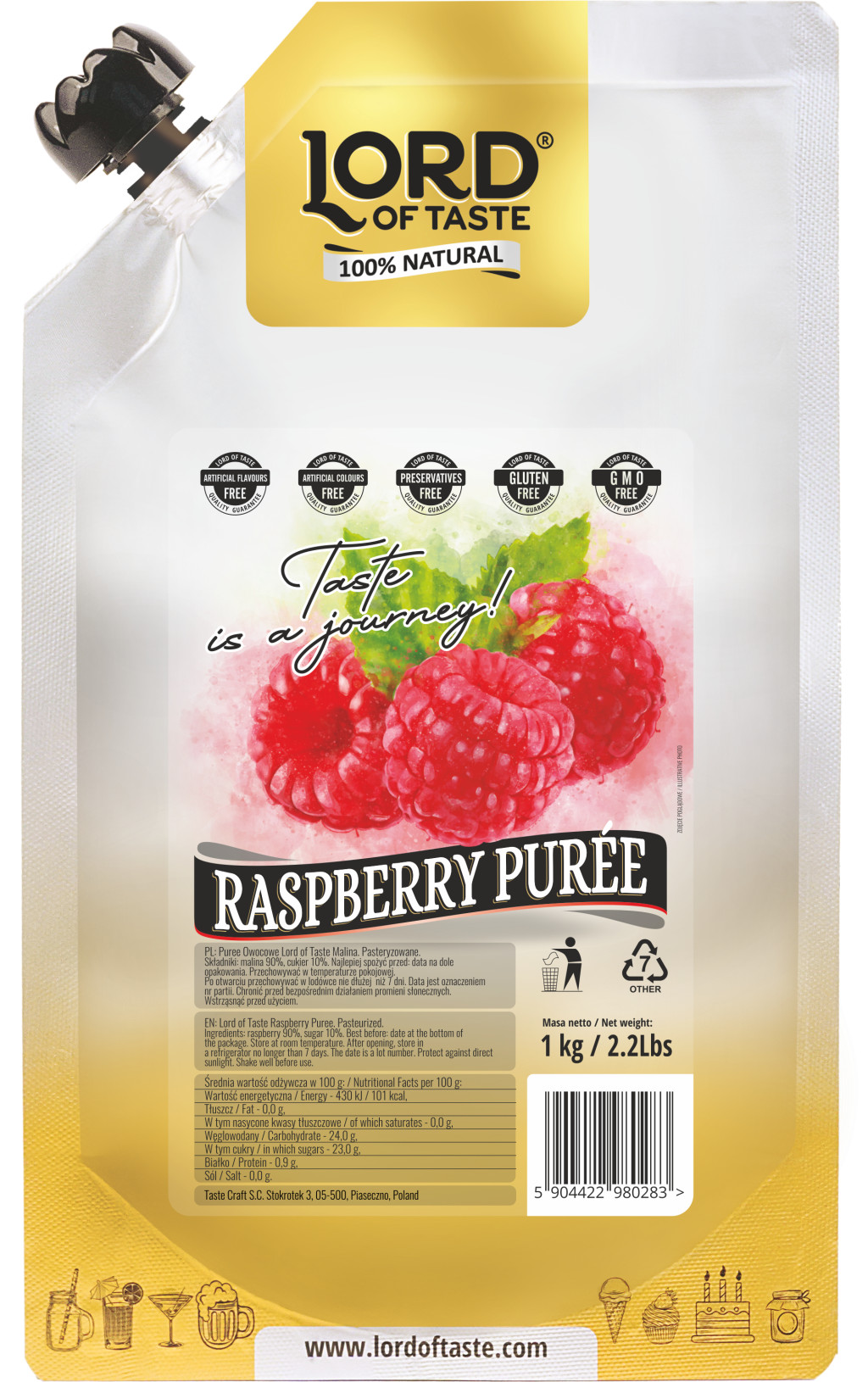 A Lord of Taste® Málna Püré a legfinomabb lengyel málnából készül, amelyet a nyári szezonban szednek. A nyári gyümölcsfajták lehetővé teszik a tökéletesen sima, mag nélküli mousse elkészítését, amelyben a édes és savanyú ízek harmonikus egyensúlyban találkoznak. A málna értékes vitaminokat és ásványi anyagokat tartalmaz, mint például C- és E-vitamint (természetes antioxidánsok), B-vitaminokat: B1, B2, B6, folsavat, valamint káliumot, kalciumot, foszfort, magnéziumot és vasat.