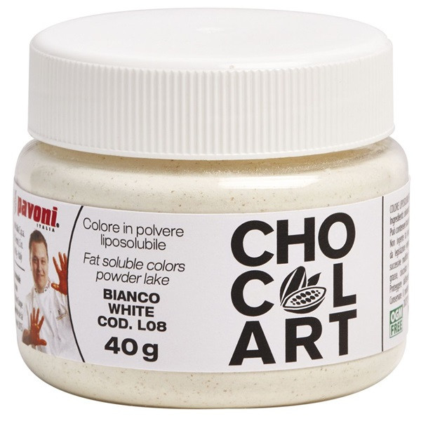 Professzionális fehér csokoládé színező festék a Pavoni-tól, AZO-mentes összetétellel. A zsírbázisú fehér pigment ideális kakaóvaj fehérítéséhez és pasztellszínek előállításához más színezőkkel keverve.