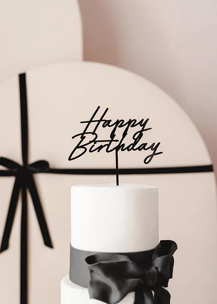 Elegáns, fekete akril tortadísz „Happy Birthday” felirattal, stílusos kiegészítő születésnapi tortákhoz.