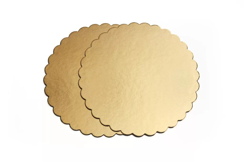 tortaalátét / tortakarton, körhullám, 18cm, 3 mm; laminált, olaj- és zsiradékálló felület (arany). Stabil, higiénikus alap díszítéshez és szállításhoz; darabos kiszerelés.