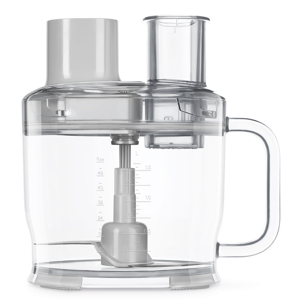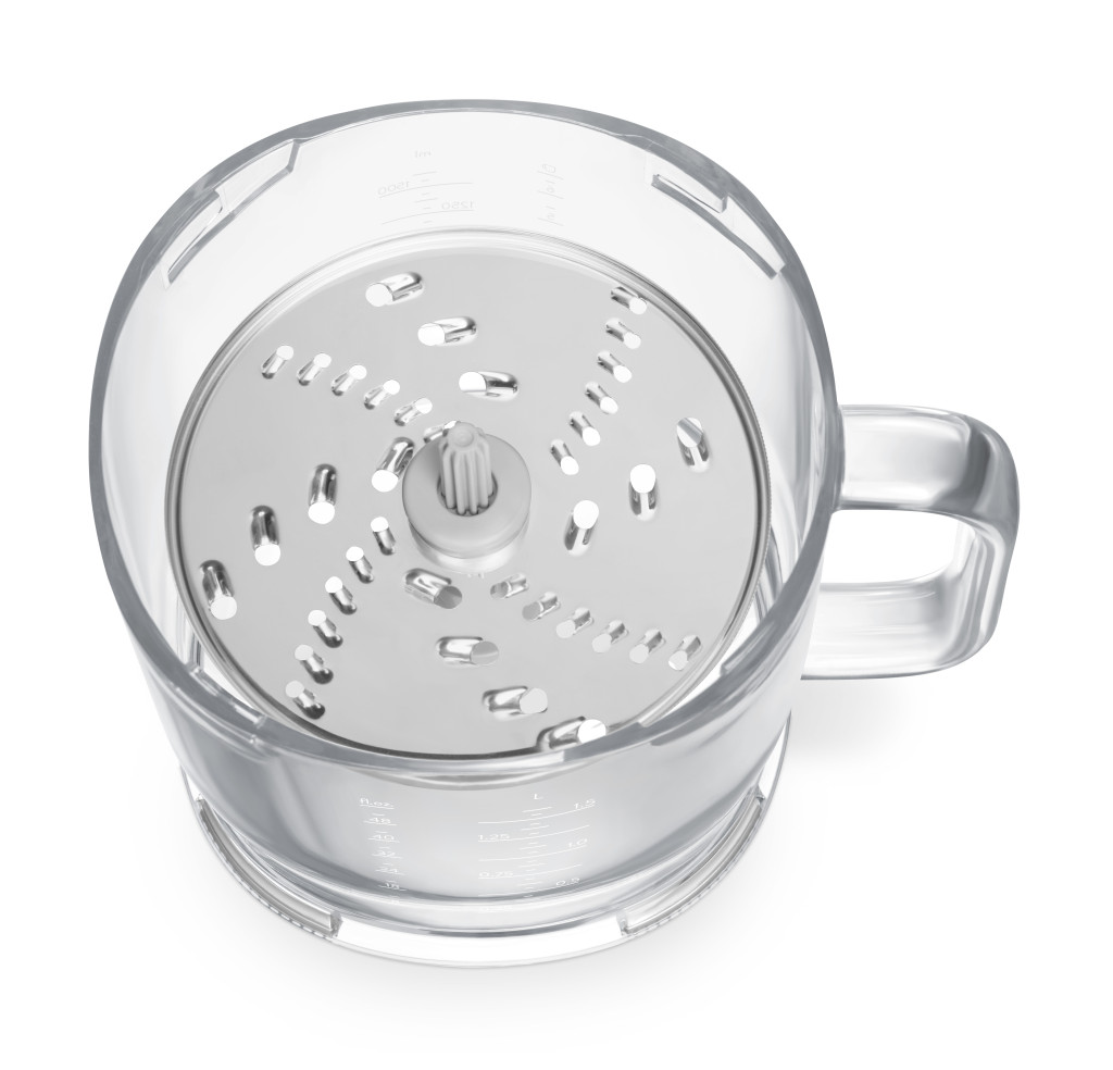 Többfunkciós 5 az 1-ben konyhai eszköz: Szeletel, aprít, reszel vagy habot ver. 1,5 literes Tritan™ Renew tál térfogatjelzésekkel (1500 ml – 1,5 liter) csúszásgátló lábakkal és kivehető hajtóművel. A mosogatógépben mosogatható tál BPA-mentes nyomórúddal van ellátva. A csomagban van még egy állítható szeletelő korong (0–6 mm/0–0,23 hüvelyk) rozsdamentes acél pengével, egy habverő korong, egy rozsdamentes acél szeletelő S penge és egy megfordítható rozsdamentes acél aprító korong durva vagy finom aprításhoz.