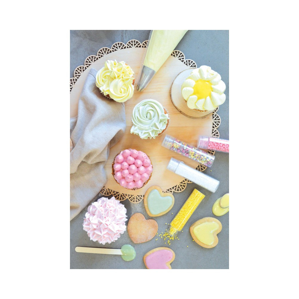 Nettó tömeg: 10 g.Felbontás után fénytől és nedvességtől védve tárolandó. Süteményekhez és cukrászsüteményekhez. Önmagában nem fogyasztható. Ne lélegezze be. Ne kerüljön a szembe.