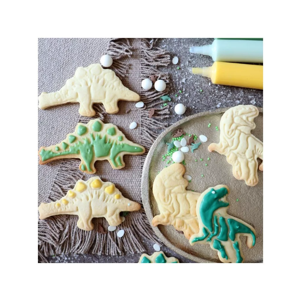 Próbáld ki a 2 darabos nyomós kiszúró készletünket, amellyel Dinos kekszeket és dinos cukormassza dekorációkat tudsz készíteni. Ezzel a készlettel elkészítheted őket egy Stegosaurus és egy T-rex formájában. Ezek a könnyen használható kiszúrók egy nyomóval rendelkeznek, amellyel könnyedén eltávolíthatod a cukormasszát.Anyag: PP műanyag.
