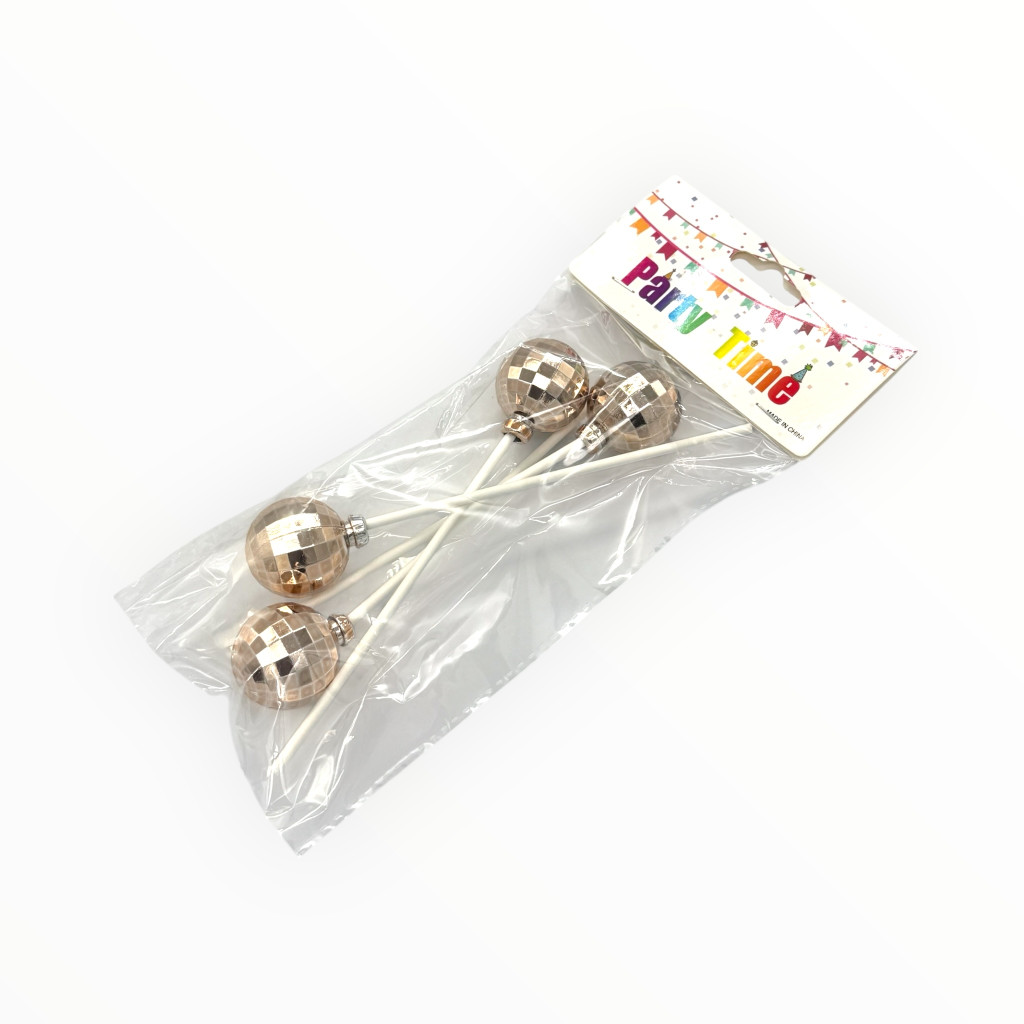 Csillogó, mini discogömb tortadekor, amely látványos kiegészítője lehet születésnapoknak, buliknak vagy bármilyen ünnepi alkalomnak. A könnyen beszúrható nyéllel rendelkező gömbök feldobják a desszerteket, tortákat vagy akár pohárkrémeket is.