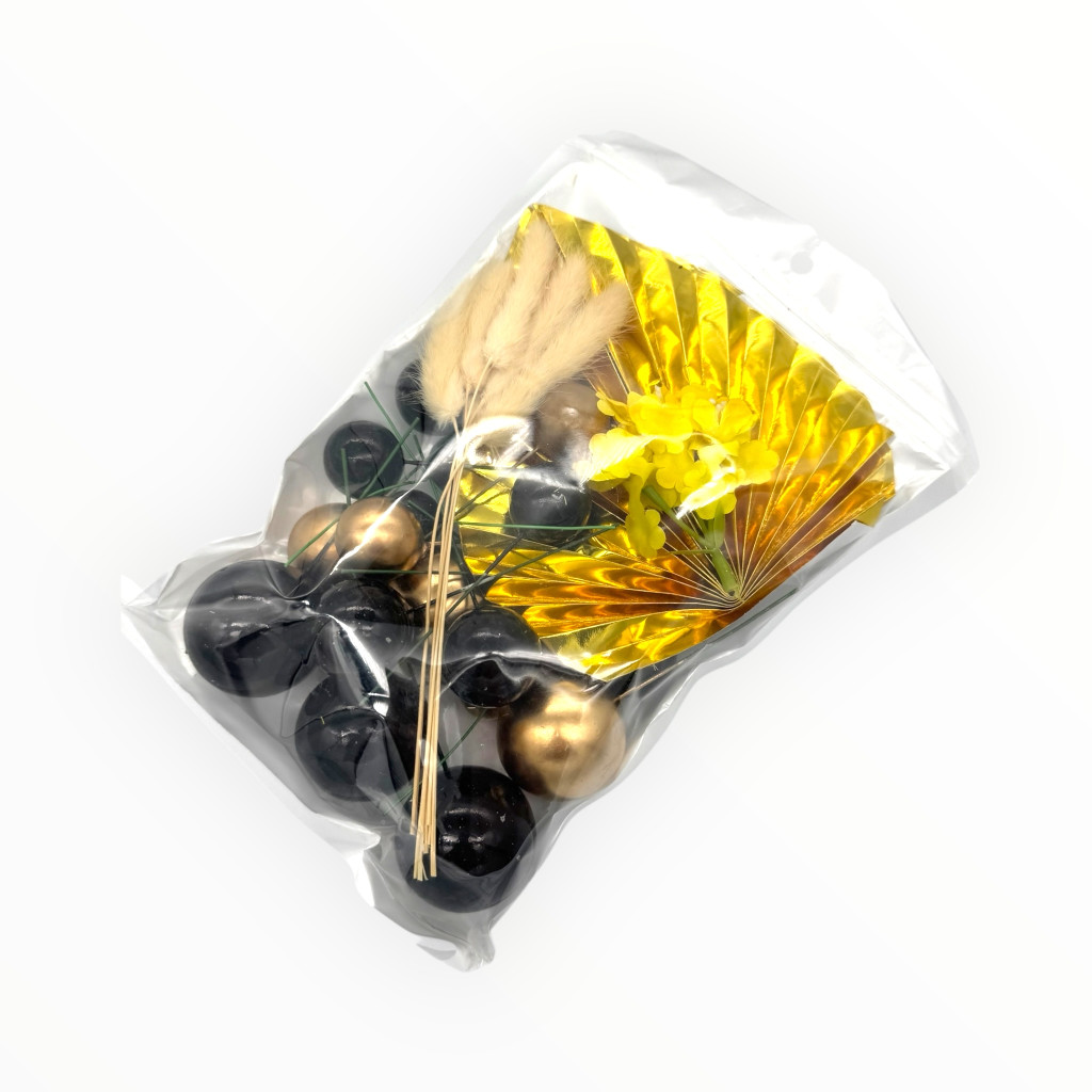 28 darabos tortadísz beszúró szett különböző méretű gömbökkel, szárított virágokkal és dekoratív kiegészítőkkel. Látványos díszítés tortákhoz ünnepi alkalmakra.