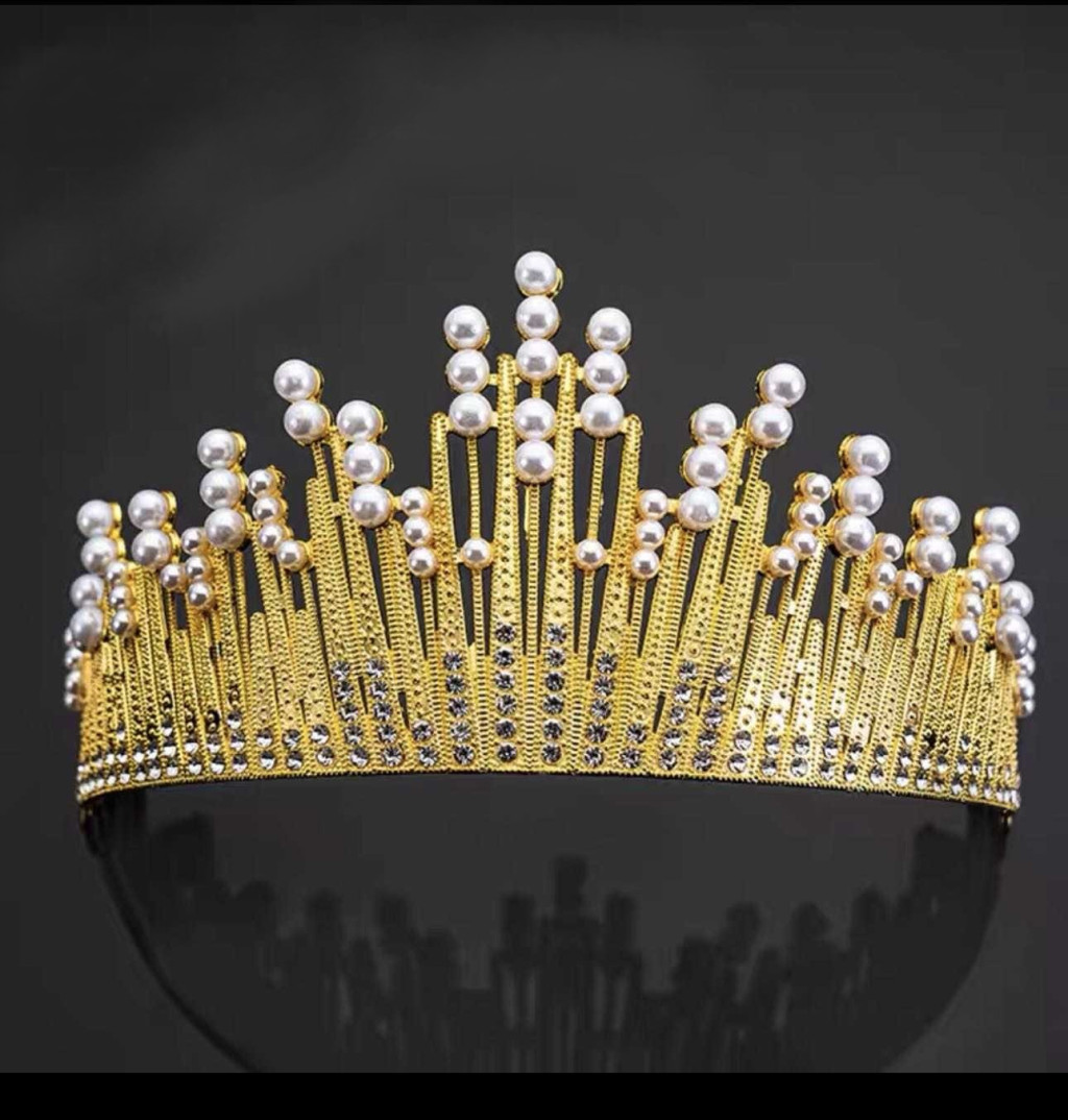 Tortadísz, korona, tiara gyöngyökkel, arany, 15cm