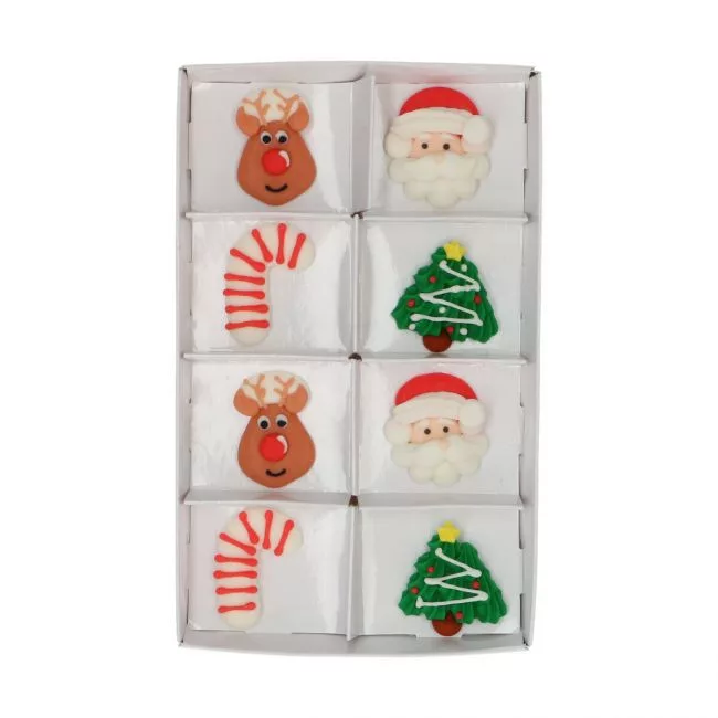 Ez a szett 8 darab színes, cukorból készült díszt tartalmaz, amelyek klasszikus karácsonyi motívumokat ábrázolnak: Mikulás, rénszarvas, nyalóka és fenyőfa formákban.