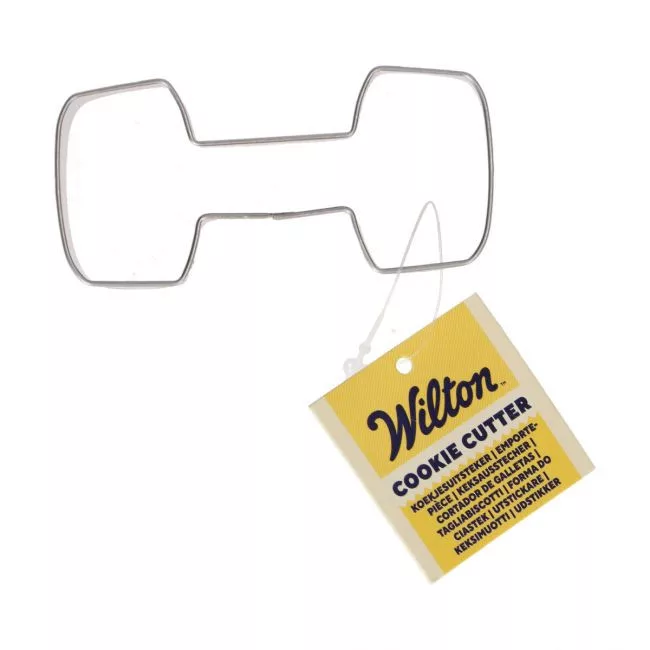 Wilton súlyzó alakú kiszúró, 8 cm. Rozsdamentes acél, tartós és mosogatógépben mosható. Sportos sütikhez szülinapokra és fitneszbulikra.
