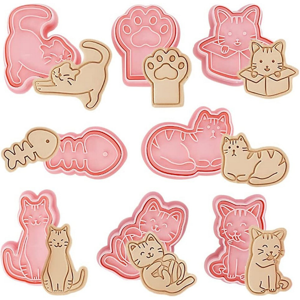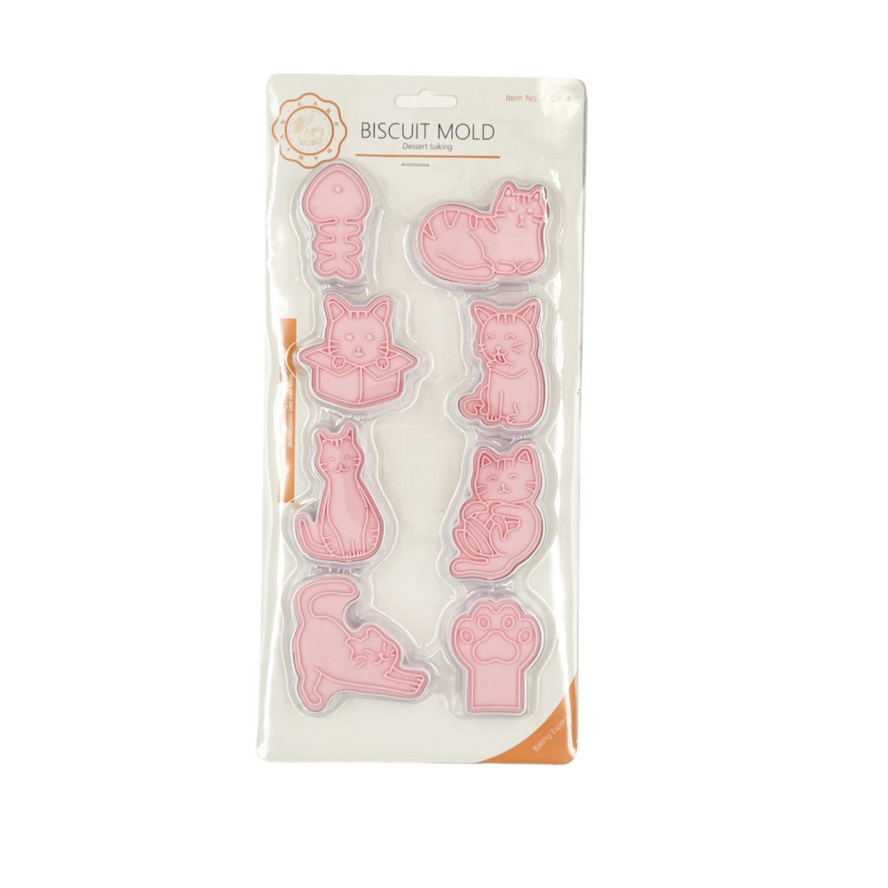 Ez a termék egy 8 darabos cica formájú kiszúró és nyomda készlet, amelyet könnyen használhat cukrászati termékek készítésére és díszítésére. A kiszúrók műanyagból készültek. A készlet segítségével könnyedén készíthet cica alakú süteményeket, kekszeket, és még sok más cukrászati terméket. A nyomda segítségével pedig könnyen és gyorsan díszítheti a cica alakokat a cukrászati termékekre. A termék Kínából származik. Egy remek kiegészítő mindazoknak, akik szeretnek kreatívak lenni és szeretik a macskákat, valamint akik szeretnének különleges és egyedi cukrászati termékeket készíteni.
