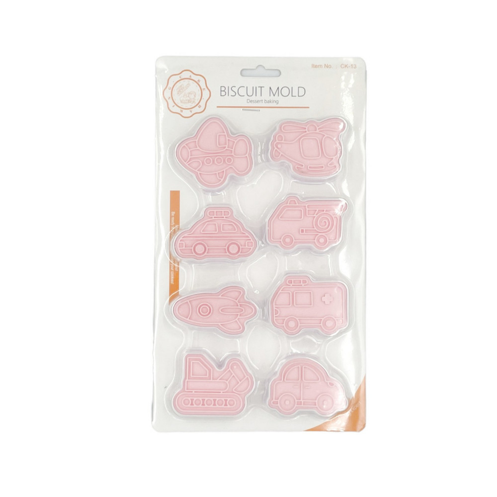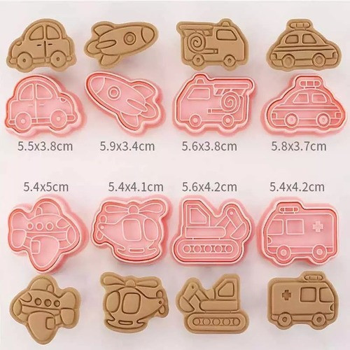 Ez a szett egy 8 darabos kiszúró és nyomda készlet áll, amely különböző jármű alakokat tartalmaz. A kiszúrók műanyagból készültek, így könnyen használhatóak és tartósak. A nyomda segítségével könnyen és gyorsan nyomtathatja a jármű alakokat a cukrászati termékekre. Egy remek kiegészítő mindazoknak, akik szeretnek kreatívak lenni és szeretik a különböző jármű formákat, valamint akik szeretnének különleges és egyedi cukrászati termékeket készíteni.Származási hely: Kína.