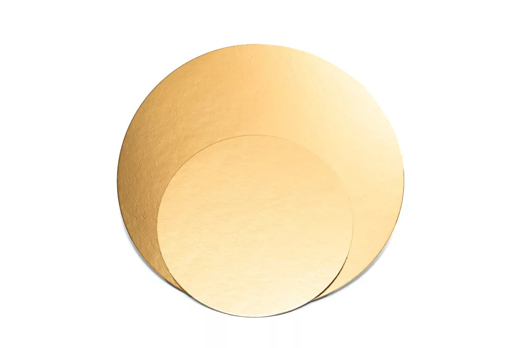 tortaalátét / tortakarton, kerek, 22cm, 1,5mm; arany, laminált felület, olajálló bevonattal. Stabil és elegáns megoldás torták és desszertek alá.