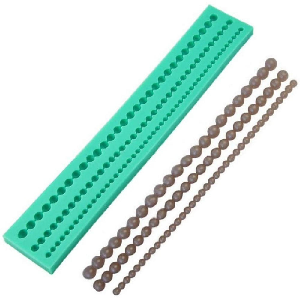 A forma gyöngysor elkészítésére alkalmas.Kiváló minőségű rugalmas szilikonanyagból készült.Készíthető benne fondantból, marcipánból és csokoládéból is forma. A termék színe eltérő lehet. Használat előtt keményítővel szükséges megszórni (fondant és marcipán esetében). A forma teljes mérete: 4cm x 29 cm. A gyöngysorok mérete: 4 mm×270 mm; 7 mm×270 mm; 9 mm×270 mm.Tisztítás: mosogatószeres vízzel.
