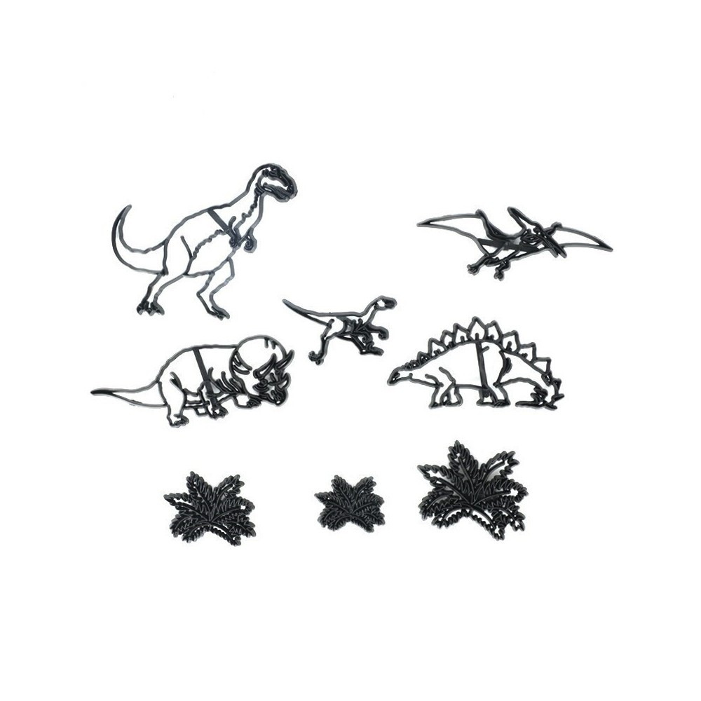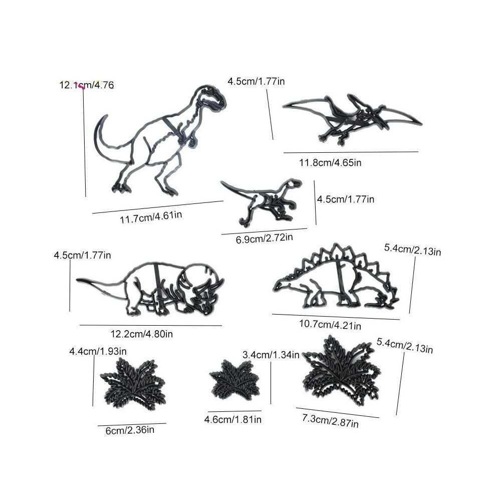 A dinószauruasz témájú sziluett kiszúrószettel különleges mintákkal díszitheted fel az elkészített tortádat.A szett 8 db különböző kiszúrót tartalmaz.A méretek megtalálhatóak a képen.
