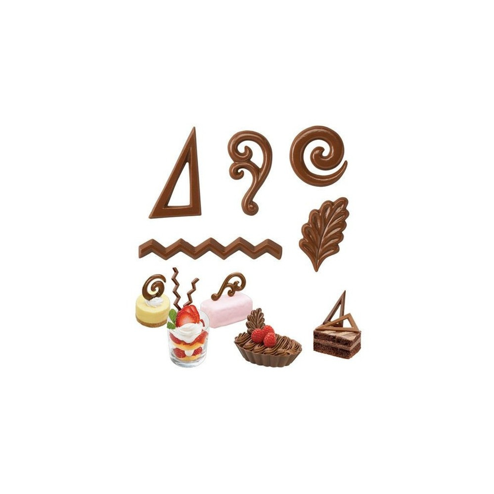 Az öntőforma különféle elegáns formákat tartalmaz – leveleket, örvényeket, tekercseket, cikkcakkokat és háromszögeket –, melyek segítségével 5 csillagos desszertdíszeket alkothatsz könnyedén.